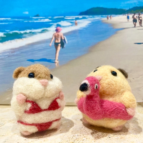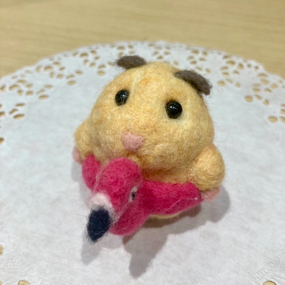 羊毛フェルトをチクチクした手作りハムちゃんです。 フラミンゴの浮き輪でウキウキです!!!!!!