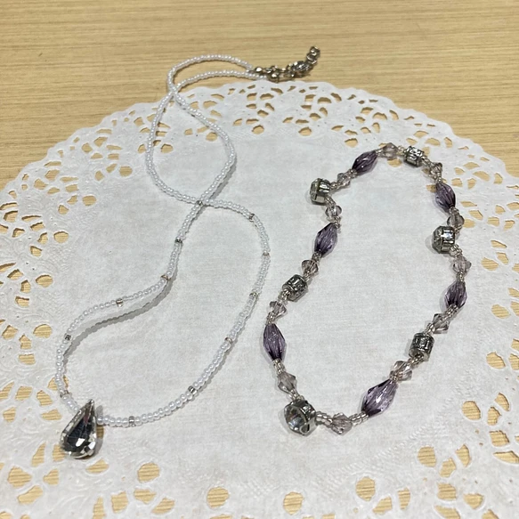 ハンドメイドのビーズネックレスとブレスレットのセットです。